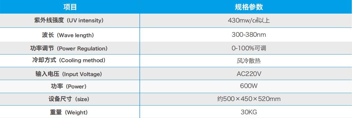 產品性能特點 :冷光源,無熱輻射、解膠速度快、節能省電無污染、即開即用、操作方便快捷