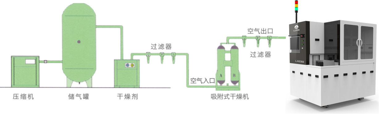 4、壓縮空氣:請使用大氣壓水汽結露點-15℃,油殘存不大于0.1ppm,過濾度0.01μm/99.5%以上的潔凈壓縮空氣,壓力0.5Mpa-0.6Mpa,流量450LPM。
