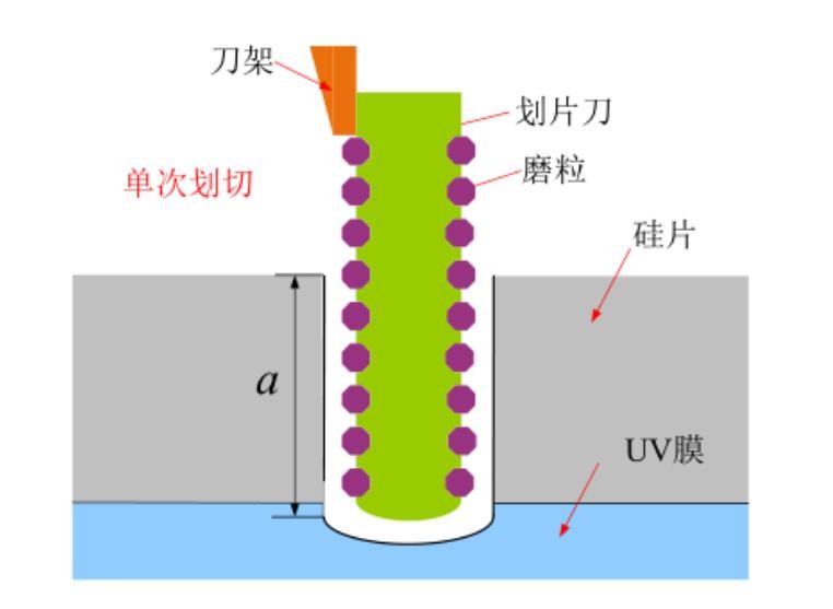 單次切割,即一次完全切割硅片,切割深度到UV膜厚度1/2的位置,如下圖所示。該方法工藝過程簡單,適合超薄材料切割,但切割過程刀具磨損嚴重,切割道邊緣易產生崩邊和毛刺,工件因受磨削力的影響,材料表面及亞表面易產生裂紋等缺陷。