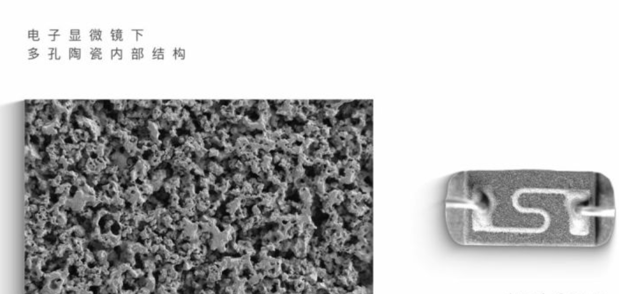 這是一張將陶瓷放大上萬倍后的照片,在一顆陶瓷芯中,像這樣的微納米孔大約有上億個。而遍布微孔的這一小塊陶瓷材料和金屬膜的結合體,構成了電子霧化器的核心部件。