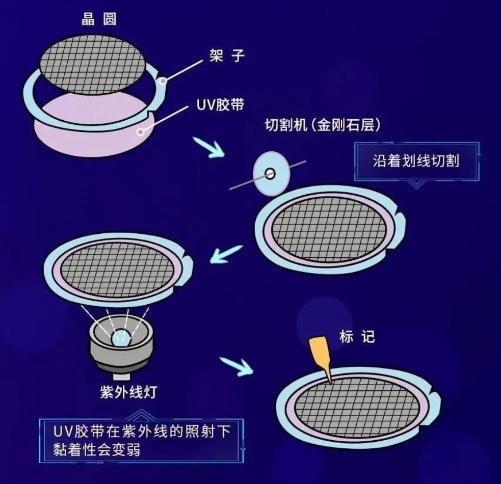 晶圓切割也叫劃片,是將晶圓經(jīng)過磨砂處理后,切割成一個個單獨(dú)的芯片,為后續(xù)工序做準(zhǔn)備的過程。