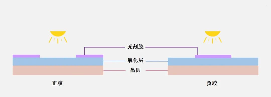 根據光(紫外線)反應性的區別,光刻膠可分為兩種:正膠和負膠,前者在受光后會分解并消失,從而留下未受光區域的圖形,而后者在受光后會聚合并讓受光部分的圖形顯現出來。