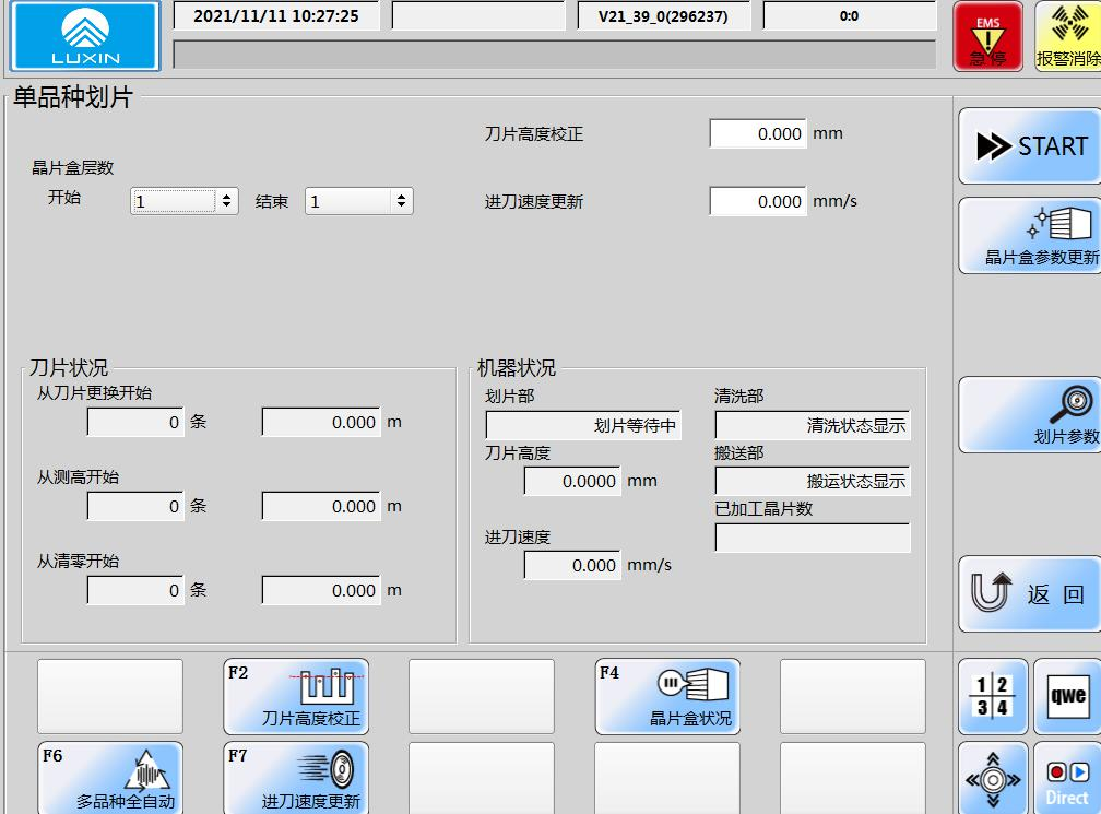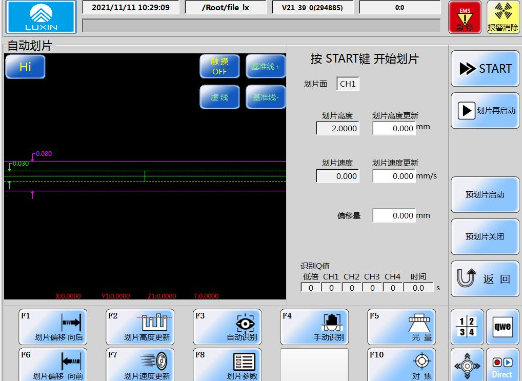 進刀速度更新:當(dāng)前劃片過程輸入速度可修改速度大小,輸入修改的速度 后,點擊F7劃片速度更新。