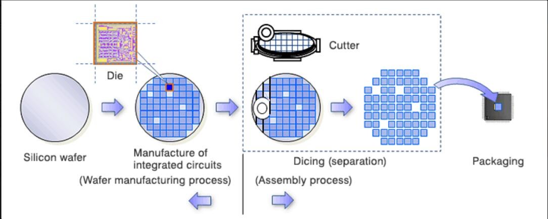 晶圓劃片(即切割)是半導(dǎo)體芯片制造工藝流程中的一道必不可少的工序,在晶圓制造中屬后道工序。將做好芯片的整片晶圓按芯片大小分割成單一的芯片(die),稱之為晶圓劃片。