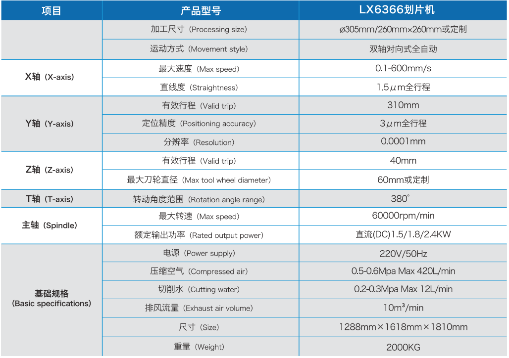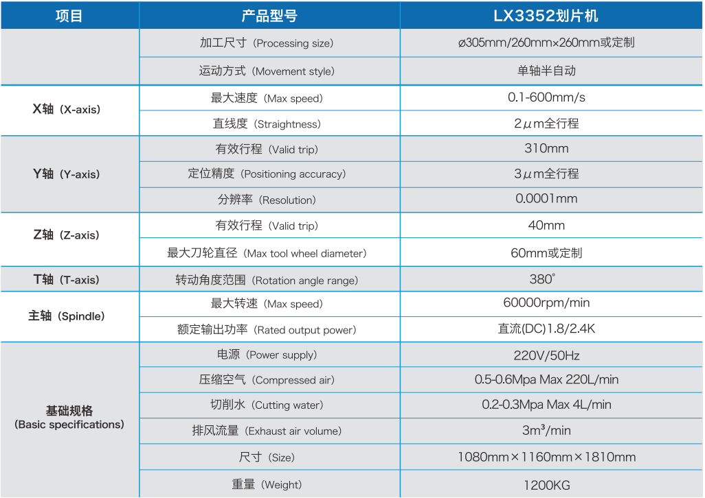 可用于集成電路QFN、壓電陶瓷、發光二極管、分離器件、光通訊器件、LED芯片、熱敏電阻、光學器件、陶瓷電路器件的劃切分離加工。適用于硅、石英、玻璃、藍寶石、氧化鋁、氧化鐵、砷化鎵和鈮酸鋰等材料的劃切加工。最大兼容8英寸-12英寸晶圓,具有單主軸和雙主軸的機型。